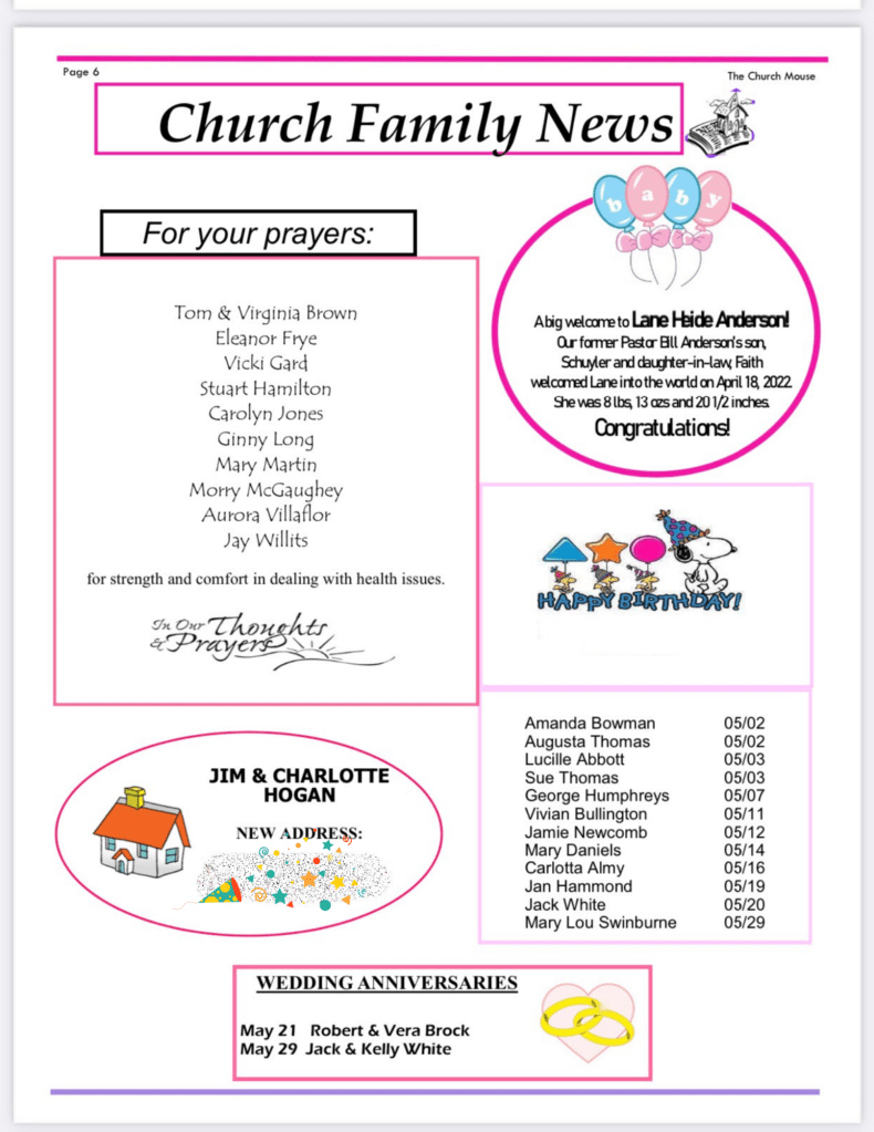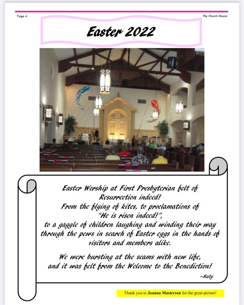 Church Mouse: May Posted byBeach Street Church - FPC DaytonaApril 29, 2022Posted inUncategorized Share this: Share on X (Opens in new window) X Share on Facebook (Opens in new window) Facebook Like Loading...