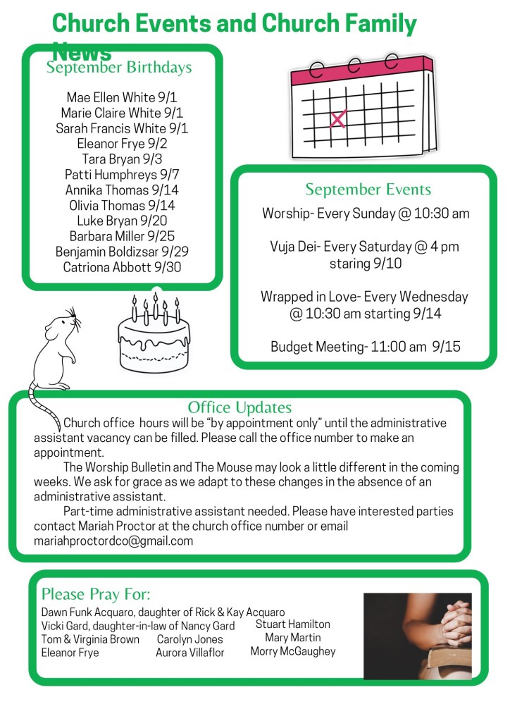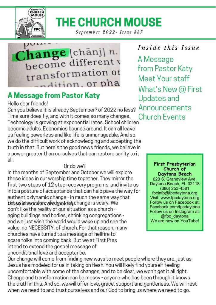 Church Mouse: September Posted byBeach Street Church - FPC DaytonaSeptember 8, 2022September 8, 2022Posted inUncategorized Share this: Share on X (Opens in new window) X Share on Facebook (Opens in new window) Facebook Like Loading...