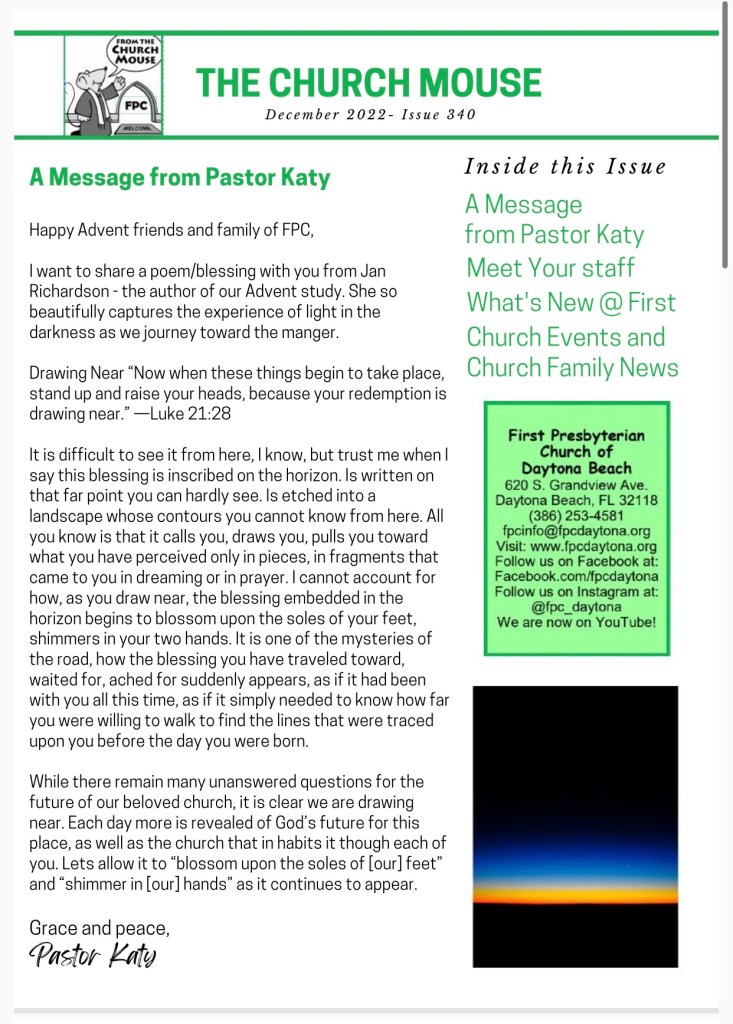 December Mouse Posted byBeach Street Church - FPC DaytonaDecember 6, 2022Posted inUncategorized Share this: Share on X (Opens in new window) X Share on Facebook (Opens in new window) Facebook Like Loading...