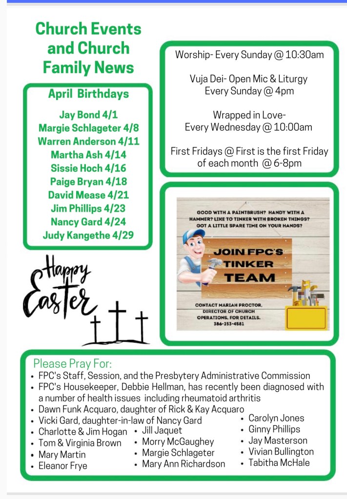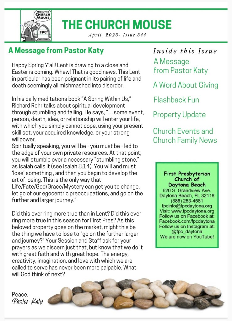 Church Mouse: April Posted byBeach Street Church - FPC DaytonaApril 7, 2023Posted inUncategorized Share this: Share on X (Opens in new window) X Share on Facebook (Opens in new window) Facebook Like Loading...