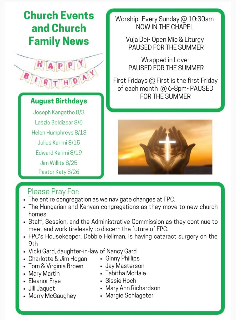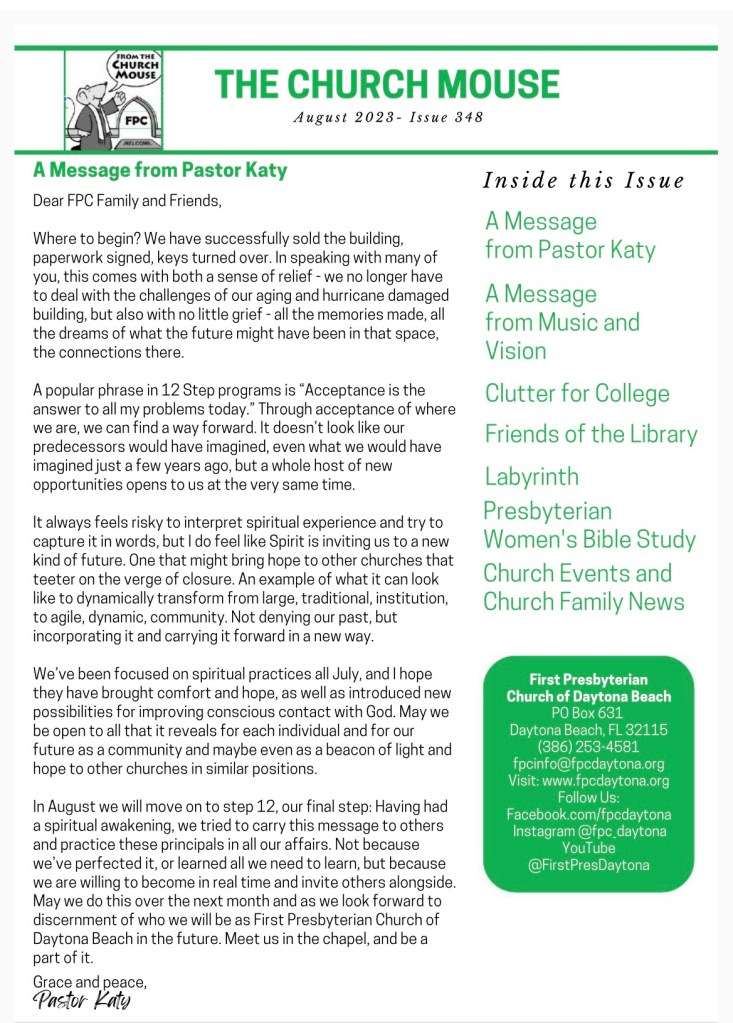 Church Mouse: August Posted byBeach Street Church - FPC DaytonaAugust 11, 2023Posted inUncategorized Share this: Share on X (Opens in new window) X Share on Facebook (Opens in new window) Facebook Like Loading...