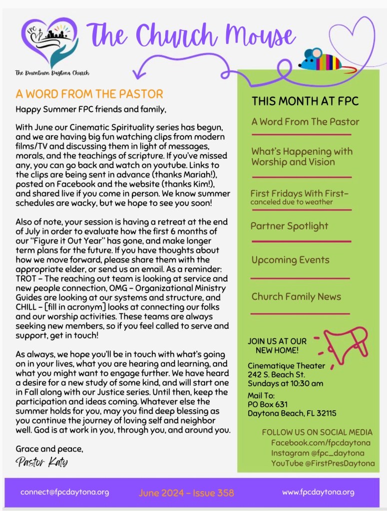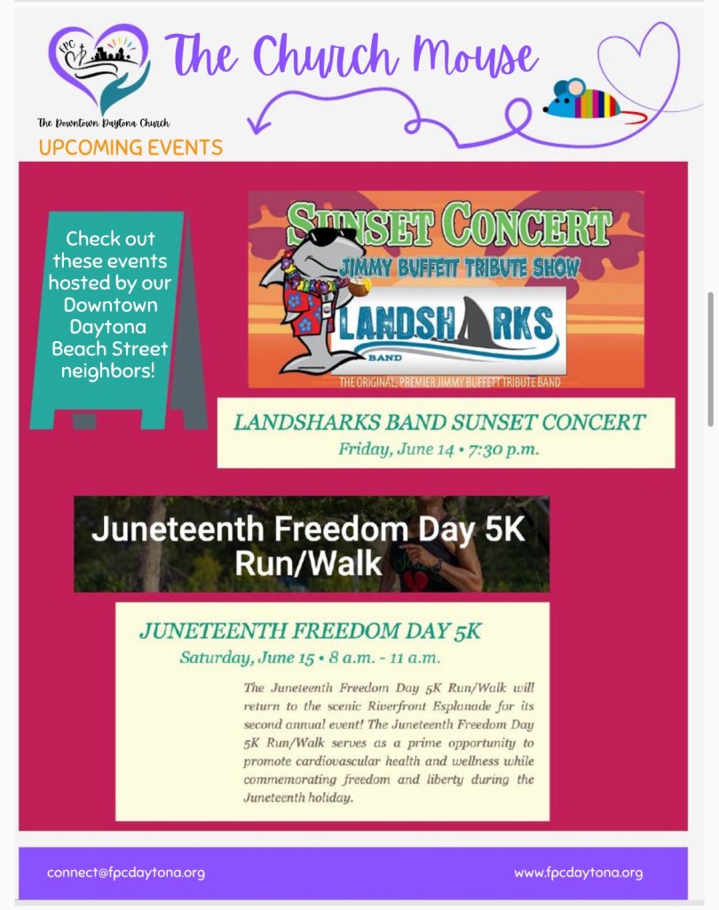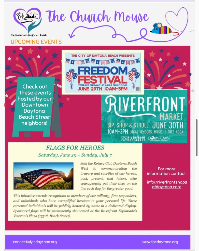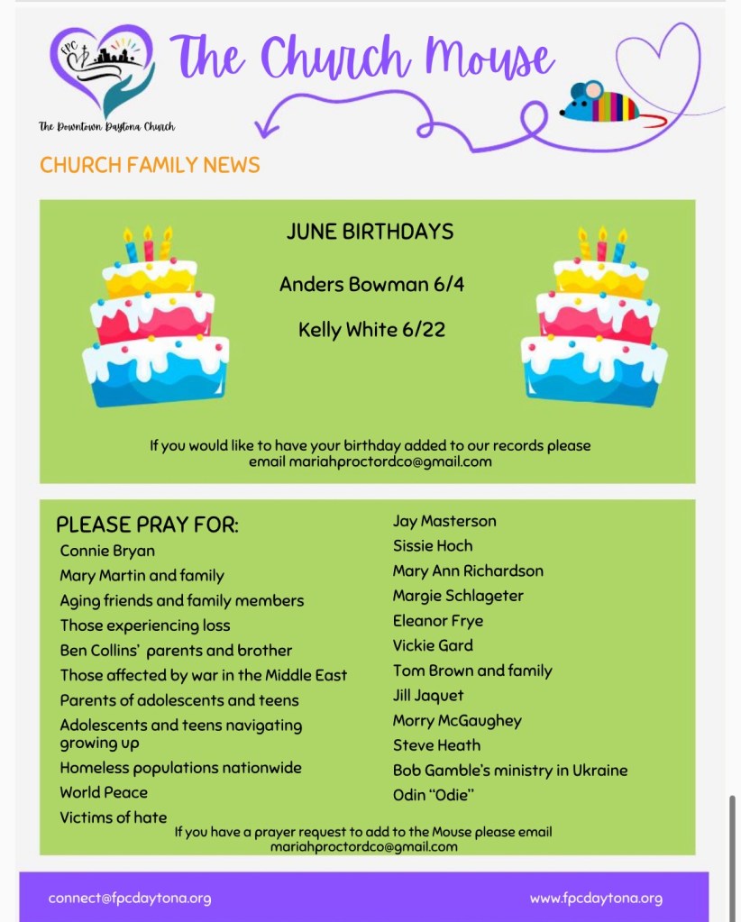 Church Mouse: June Posted byBeach Street Church - FPC DaytonaJune 10, 2024June 11, 2024Posted inUncategorized Share this: Share on X (Opens in new window) X Share on Facebook (Opens in new window) Facebook Like Loading...